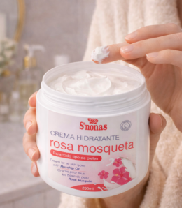 Crema hidratante con aceite de rosa mosqueta, ideal para nutrir y suavizar todo tipo de pieles.