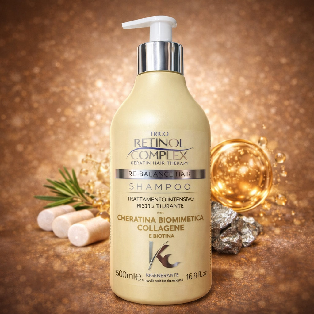 El Champú Retinol Complex Re-Balance Hair está diseñado para limpiar el cabello mientras ayuda a mejorar su apariencia y manejabilidad. Su fórmula incorpora queratina biomimética, colágeno y biotina, ingredientes utilizados en el cuidado capilar para ayudar a mantener el cabello con aspecto más fuerte y cuidado.