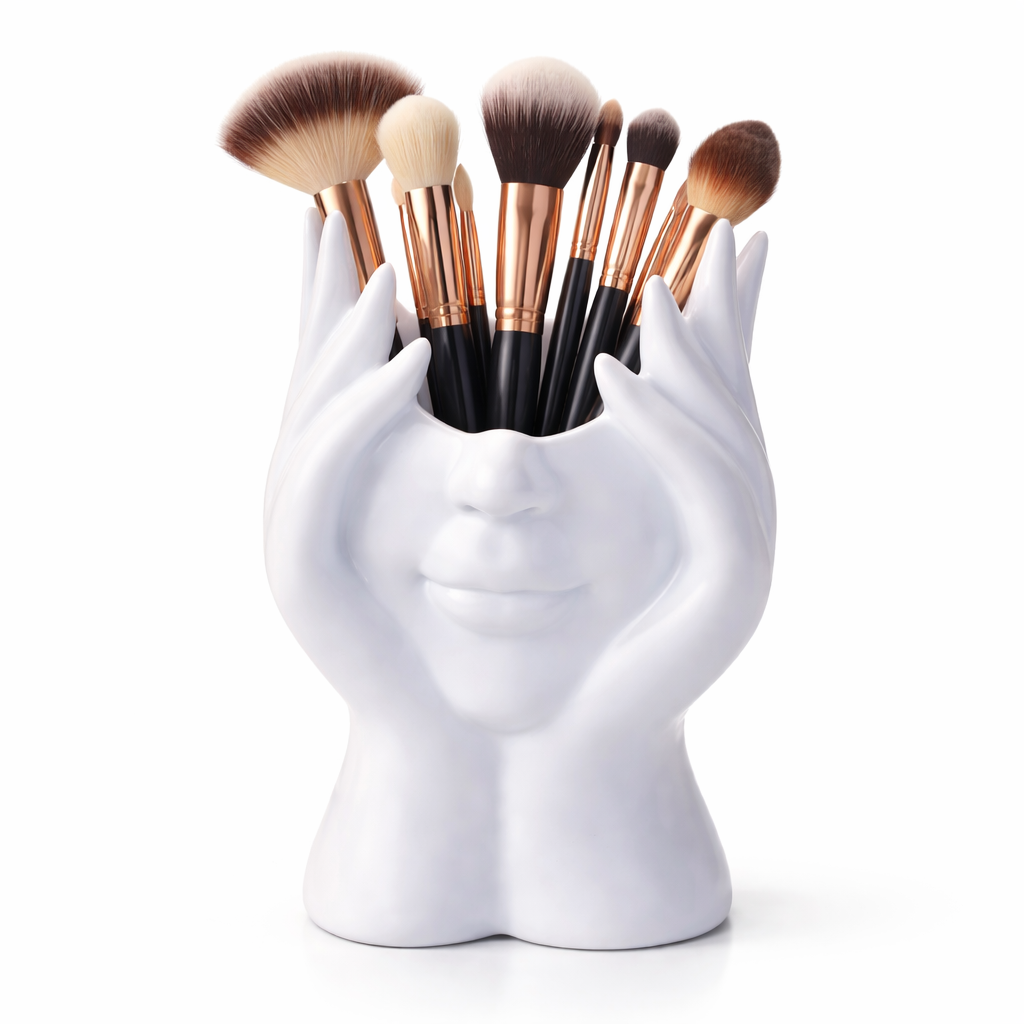 El Organizador de Brochas Decorativo Rostro Blanco combina funcionalidad y diseño en una pieza única para tu tocador. Su original forma de rostro con manos crea un efecto artístico y elegante, ideal para organizar brochas de maquillaje, lápices cosméticos o accesorios de belleza.