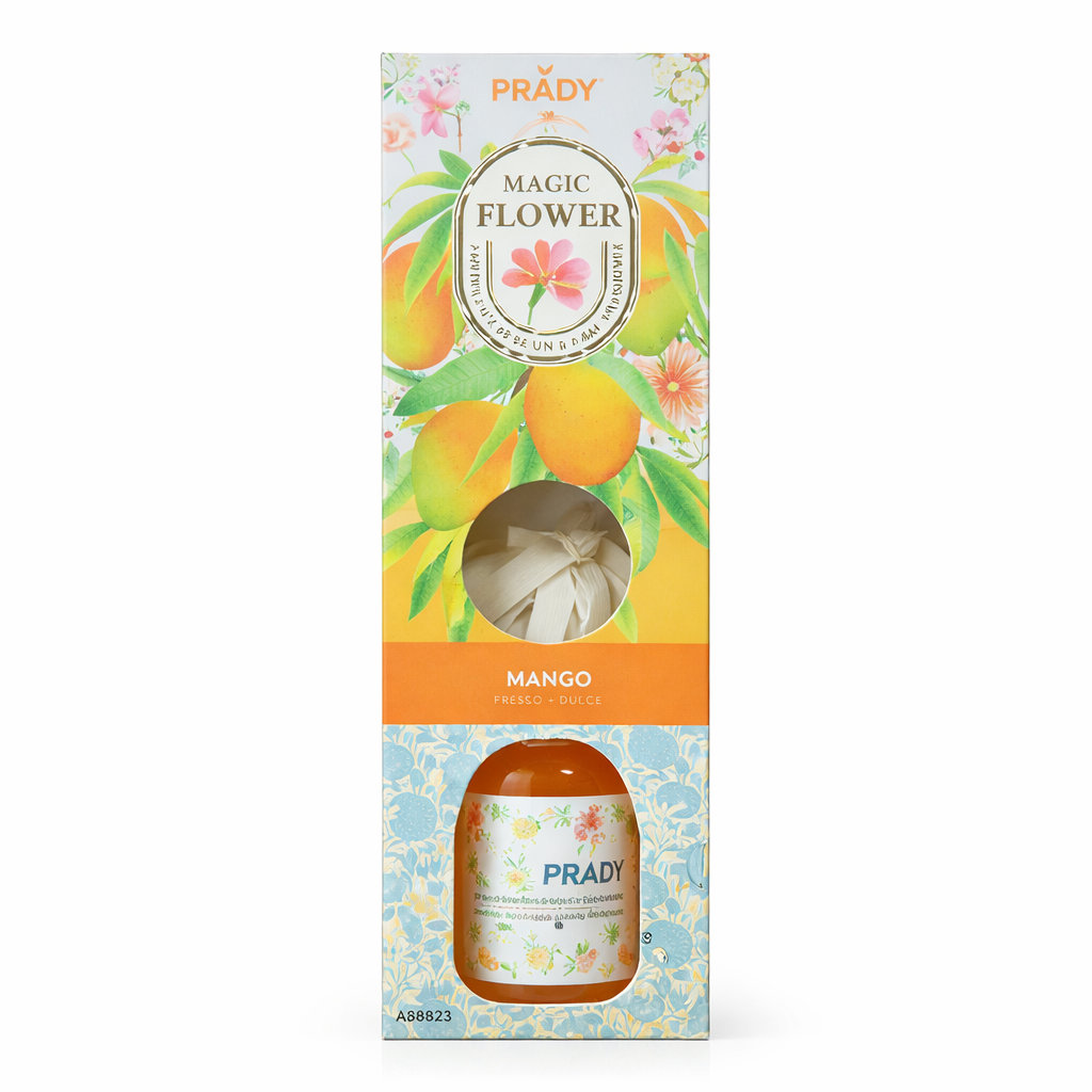 El Prady Magic Flower Ambientador Mikado Mango es un difusor aromático diseñado para perfumar los espacios con una fragancia frutal dulce y tropical. Su aroma a mango aporta una sensación fresca, alegre y acogedora, ideal para crear un ambiente agradable en cualquier estancia del hogar.